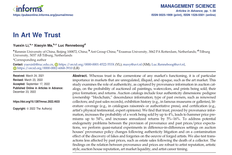 Dr. Yuexin Li recently had a paper published in the Management Science. The paper titled‘In Art We Trust’, was coauthored with Xiaoyin Ma from Ant Group China, and Luc Renneboog from Tilburg University.