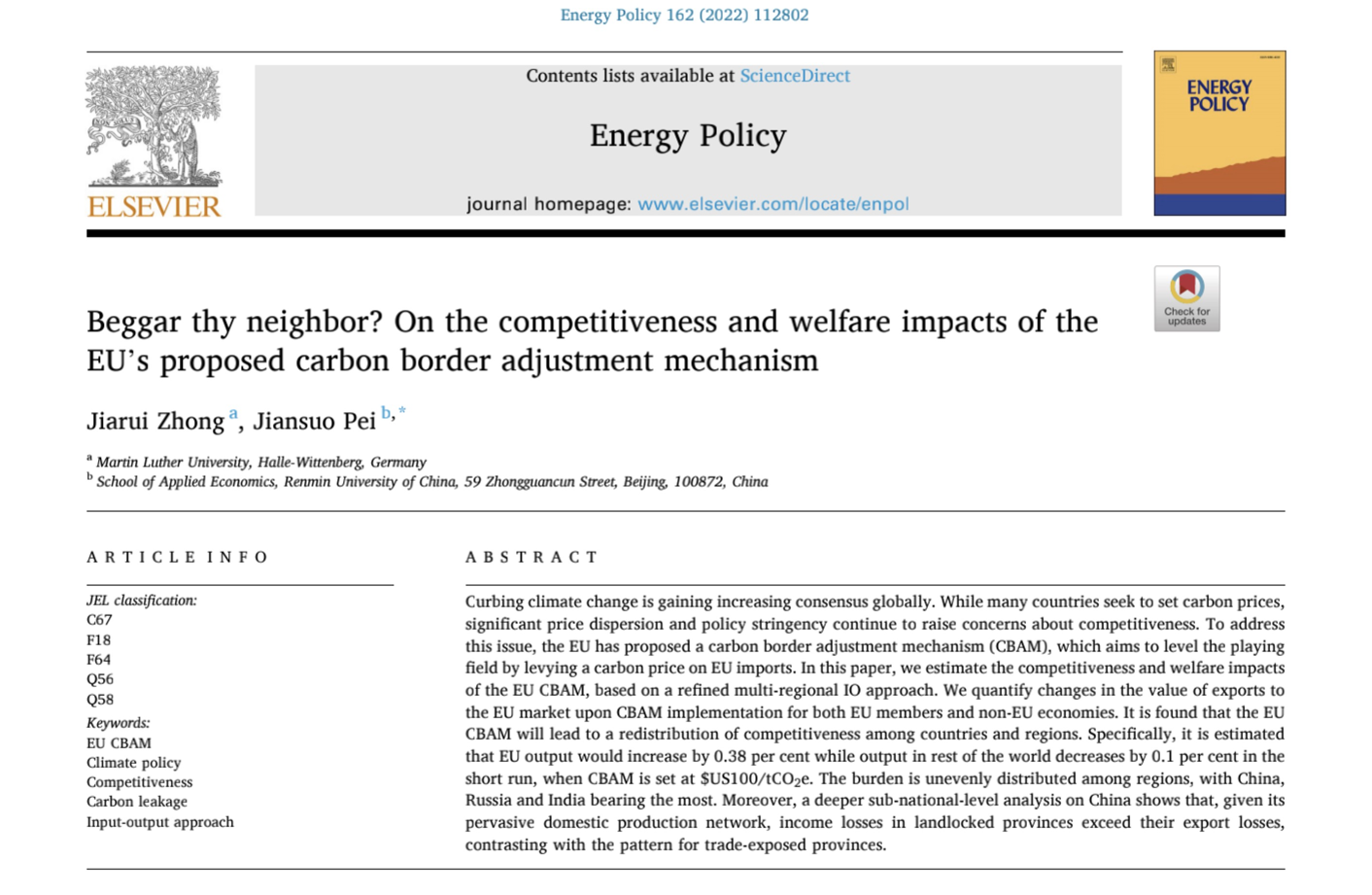 Dr. Jiansuo Pei recently had a paper published in the Energy Policy.The paper titled‘Beggar thy neighbor? On the competitiveness and welfare impacts of the EU’s proposed carbon border adjustment mechanism’, was coauthored with Jiarui Zhong from Martin Luther University.