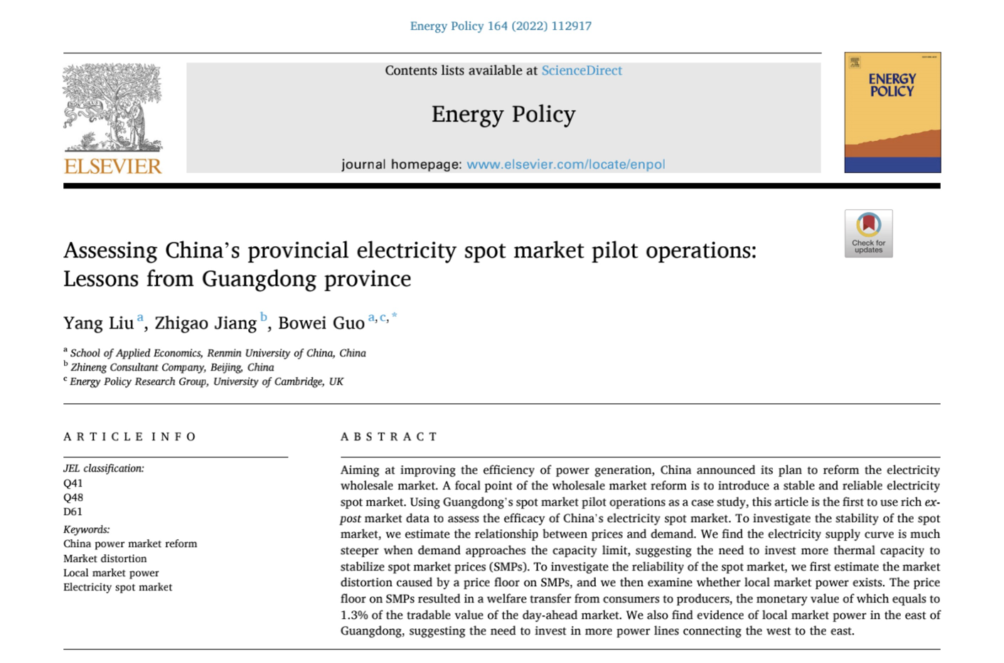Dr. Yang Liu recently had a paper published in the Energy Policy. The paper titled‘Assessing China’s provincial electricity spot market pilot operations: Lessons from Guangdong province’, was coauthored withZhigao Jiang from Zhineng Consultant Company, Bowei Guo from School of Applied Economics, Ren...