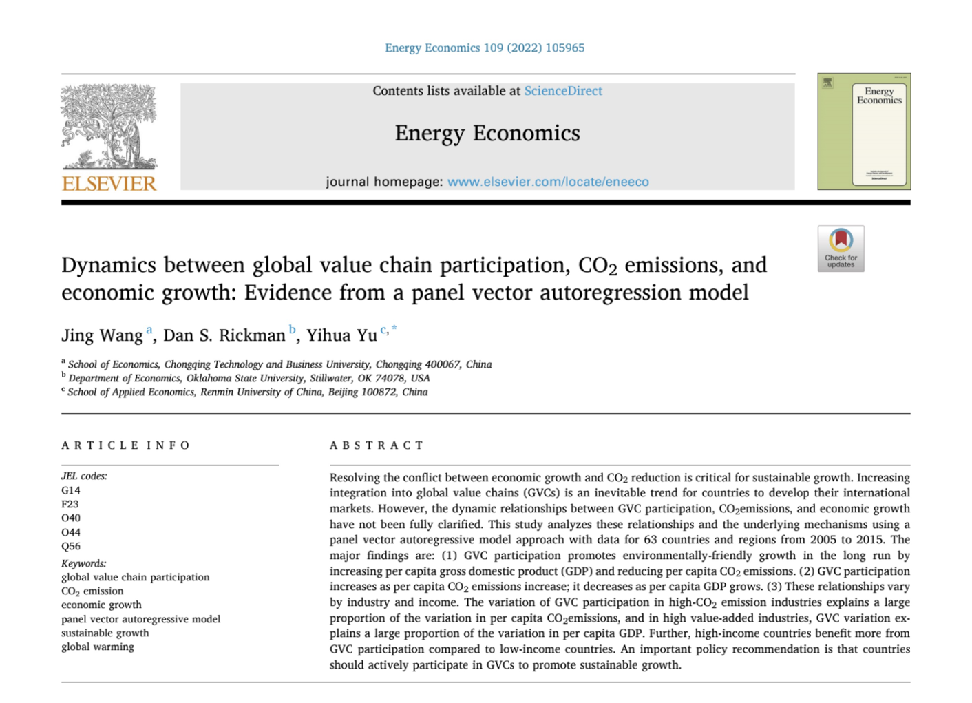 Dr. Yihua Yu recently had a paper published in the Energy Economics. The paper titled‘Dynamics between global value chain participation, CO2 emissions, and economic growth: Evidence from a panel vector autoregression model’, was coauthored with Jing Wang from School of Economics, Chongqing Technolog...