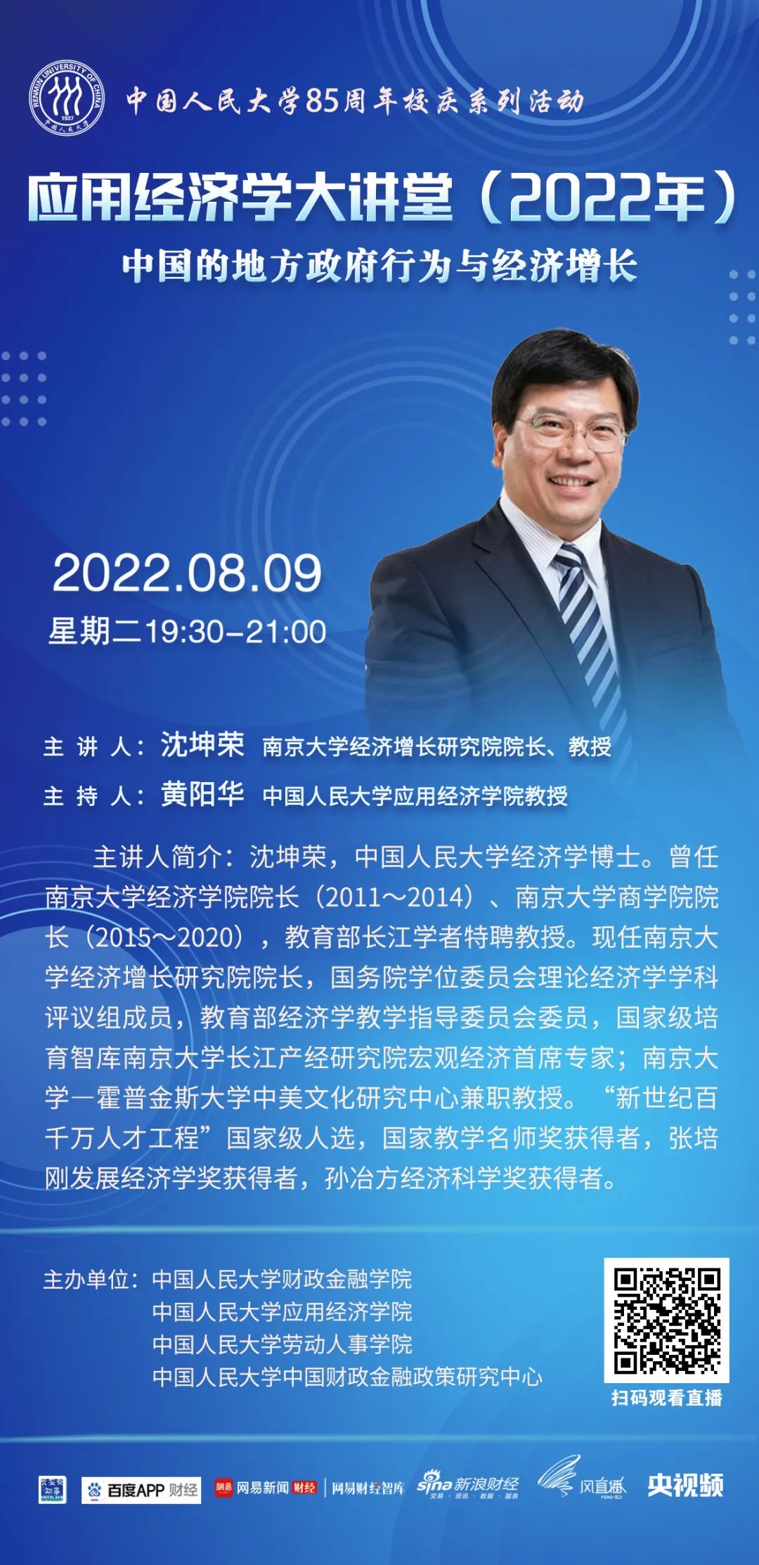 为进一步服务于国务院学位委员会应用经济学学科评议组,推动中国应用经济学科整体快速发展,成人动画 应用经济学科在继续承办“应用经济学年会”(冬季)、《应用经济学评论》的基础上,推出“应用经济学大讲堂”(夏季)系列讲座,旨在通过汇集全国高校应用经济学科学术带头人与青年学者代表,打造一个顶尖学者交流研讨、协同创新、共谋发展的学术交流平台,针对新时代国民经济和社会发展的重大需求,聚焦中国特色社会主义市场经济建设,总结提升中国发展经验,为世界贡献新的理论和解决方案。第三讲由南京大学经济增长研究院院长沈坤荣教授主讲。