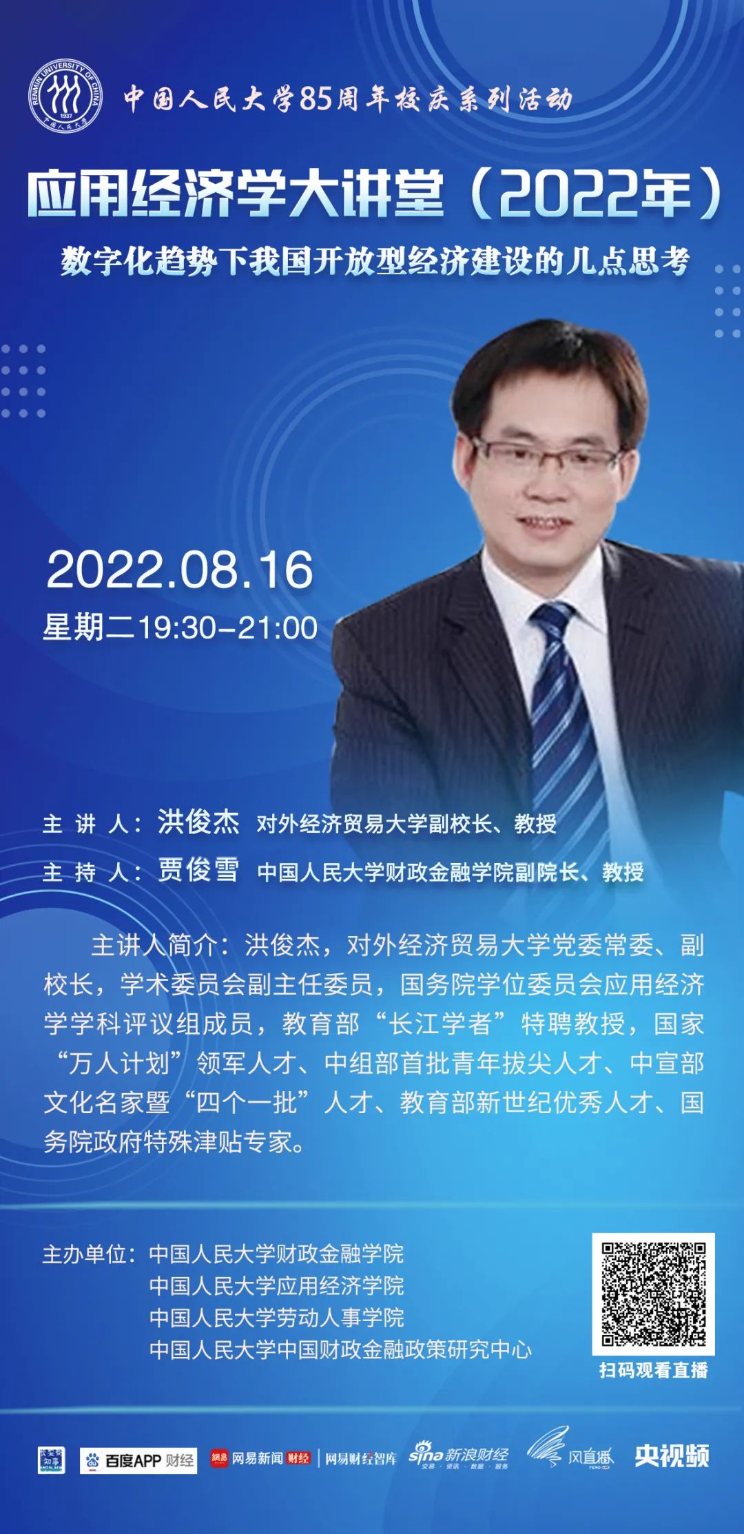 为进一步服务于国务院学位委员会应用经济学学科评议组,推动中国应用经济学科整体快速发展,成人动画 应用经济学科在继续承办“应用经济学年会”(冬季)、《应用经济学评论》的基础上,推出“应用经济学大讲堂”(夏季)系列讲座。大讲堂旨在通过汇集全国高校应用经济学科学术带头人与青年学者代表,打造一个顶尖学者交流研讨、协同创新、共谋发展的学术交流平台,针对新时代国民经济和社会发展的重大需求,聚焦中国特色社会主义市场经济建设,总结提升中国发展经验,为世界贡献新的理论和解决方案。第五场讲座由对外经济贸易大学副校长洪俊杰教授主讲。