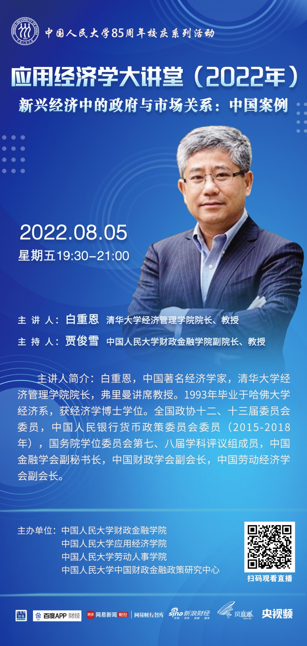 为进一步服务于国务院学位委员会应用经济学学科评议组,推动中国应用经济学科整体快速发展,成人动画 应用经济学科在继续承办“应用经济学年会”(冬季)、《应用经济学评论》的基础上,推出“应用经济学大讲堂”(夏季)系列讲座。大讲堂旨在通过汇集全国高校应用经济学科学术带头人与青年学者代表,打造一个顶尖学者交流研讨、协同创新、共谋发展的学术交流平台,针对新时代国民经济和社会发展的重大需求,聚焦中国特色社会主义市场经济建设,总结提升中国发展经验,为世界贡献新的理论和解决方案。第二场讲座由清华大学经济管理成人动画 院长白重恩教授主讲。