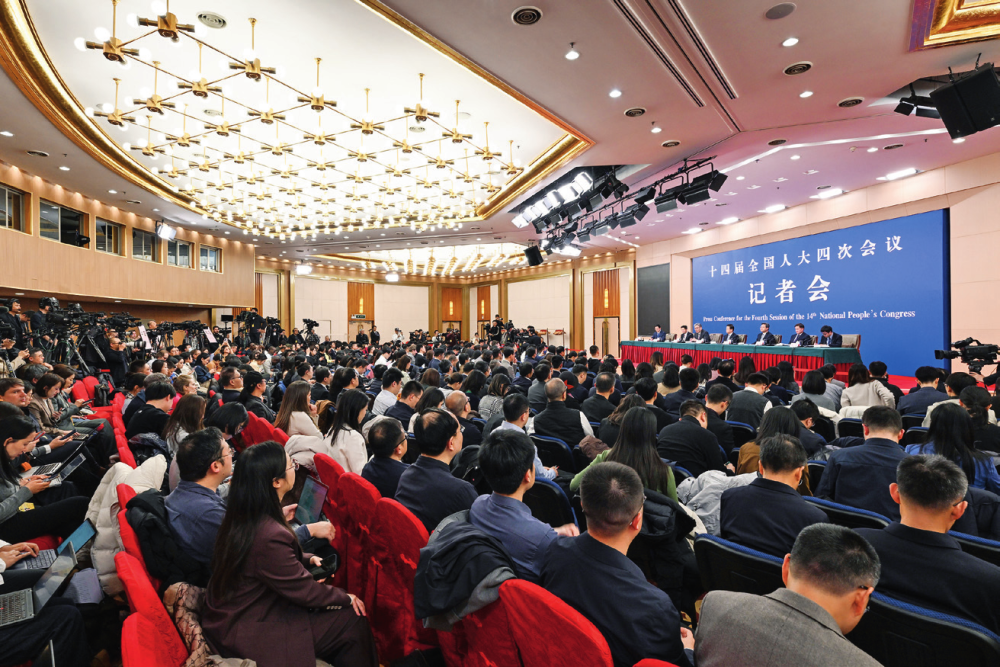 ▲十四届全国人大四次会议在北京梅地亚中心新闻发布厅举行记者会。国家 发展和改革委员会主任郑栅洁、财政部部长蓝佛安、商务部部长王文涛、中国人民银行行长潘功胜、中国证券监督管理委员会主席吴清就发展改革、财政预算、 商务、金融证券等相关问题回答中外记者提问(2026 年 3 月 6 日摄)曹祎铭摄 /《瞭望》新闻周刊
